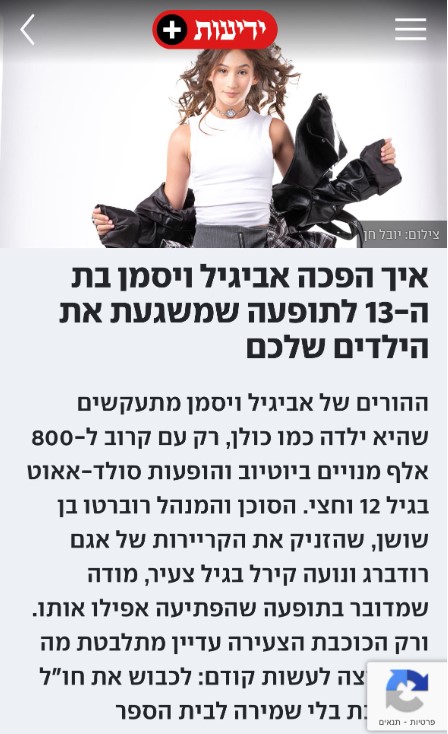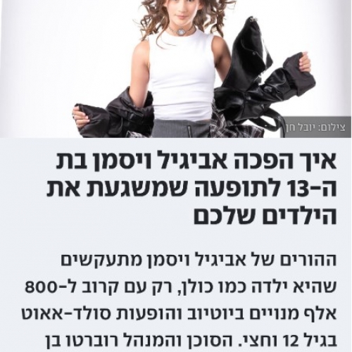 הזמרת וכוכבת הרשת אביגיל ויסמן היא התופעה החדשה והחמה ביותר בקרב הדור הצעיר. בתוך פחות משנה בלבד פרצה עם שורת להיטים מטורפת שהפכו אותה לאחת הדמויות המזוהות, האהובות והמצוטטות לילדים בישראל.